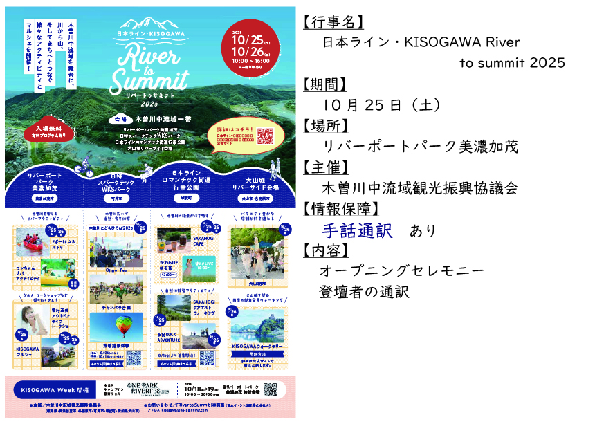 イベントのご案内 聴覚障がいに関連するイベント及び情報保障がつく行事を掲載しております。 大関ヶ原祭2025 詳細はこちらをご確認下さい。 ねんりんピック2025 総合開会式 詳細はこちらをご確認下さい。 ねんりんピック2025 講演会 詳細はこちらをご確認下さい。 第30回長良川ふれあいマラソン大会 詳細はこちらをご確認下さい。 ねんりんピック2025 総合閉会式 詳細はこちらをご確認下さい。 第36回岐阜県農業フェスティバル 詳細はこちらをご確認下さい。 日本ライン・KISOGAWA River to summit 2025 詳細はこちらをご確認下さい。