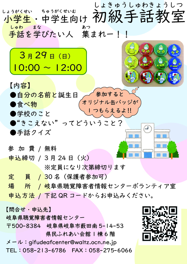 小学生・中学生を対象とした初級手話教室を開催しています。(不定期・長期休暇期間のみ)保護者と一緒に参加も可能です!