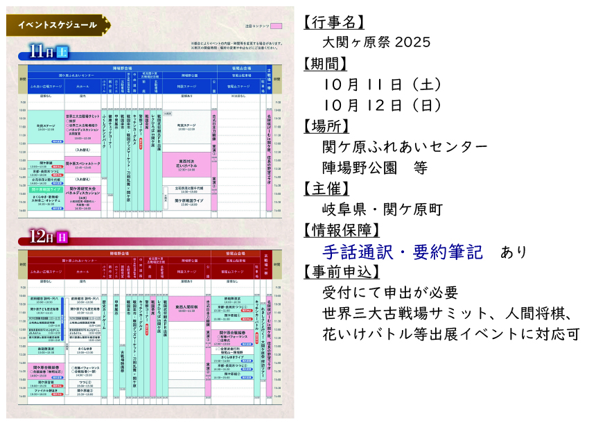 イベントのご案内 聴覚障がいに関連するイベント及び情報保障がつく行事を掲載しております。 大関ヶ原祭2025 詳細はこちらをご確認下さい。 ねんりんピック2025 総合開会式 詳細はこちらをご確認下さい。 ねんりんピック2025 講演会 詳細はこちらをご確認下さい。 第30回長良川ふれあいマラソン大会 詳細はこちらをご確認下さい。 ねんりんピック2025 総合閉会式 詳細はこちらをご確認下さい。 第36回岐阜県農業フェスティバル 詳細はこちらをご確認下さい。 日本ライン・KISOGAWA River to summit 2025 詳細はこちらをご確認下さい。