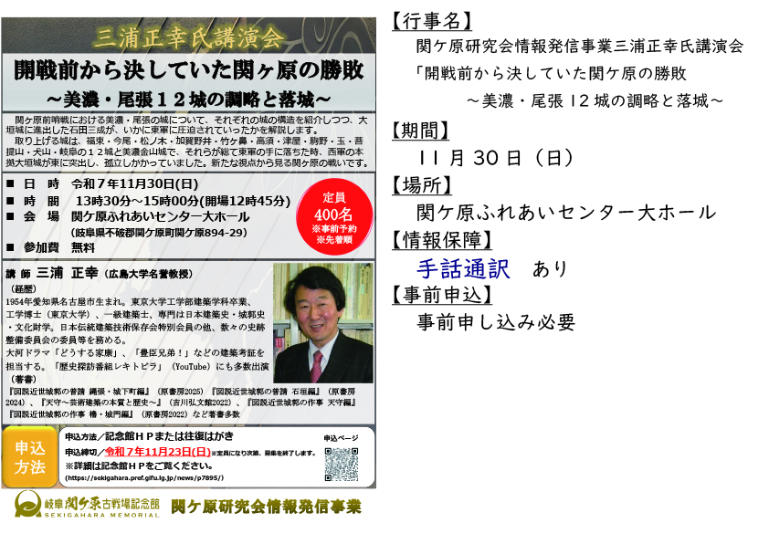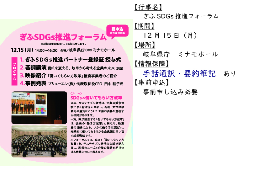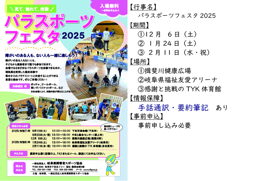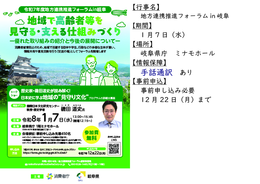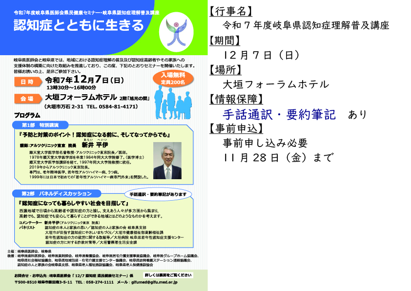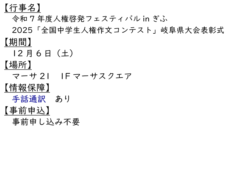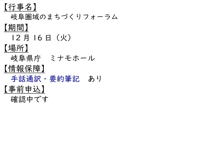 イベントのご案内 聴覚障がいに関連するイベント及び情報保障がつく行事を掲載しております。 関ケ原研究会情報発信事業三浦正幸氏講演会 詳細はこちらをご確認下さい。 令和7年度人権啓発フェスティバルinぎふ 令和7年度岐阜県認知症理解普及講座 詳細はこちらをご確認下さい。 ぎふSDGs推進フォーラム 岐阜圏域のまちづくりフォーラム 地方連携推進フォーラムin岐阜 詳細はこちらをご確認下さい。 パラスポーツフェスタ 詳細はこちらをご確認下さい。